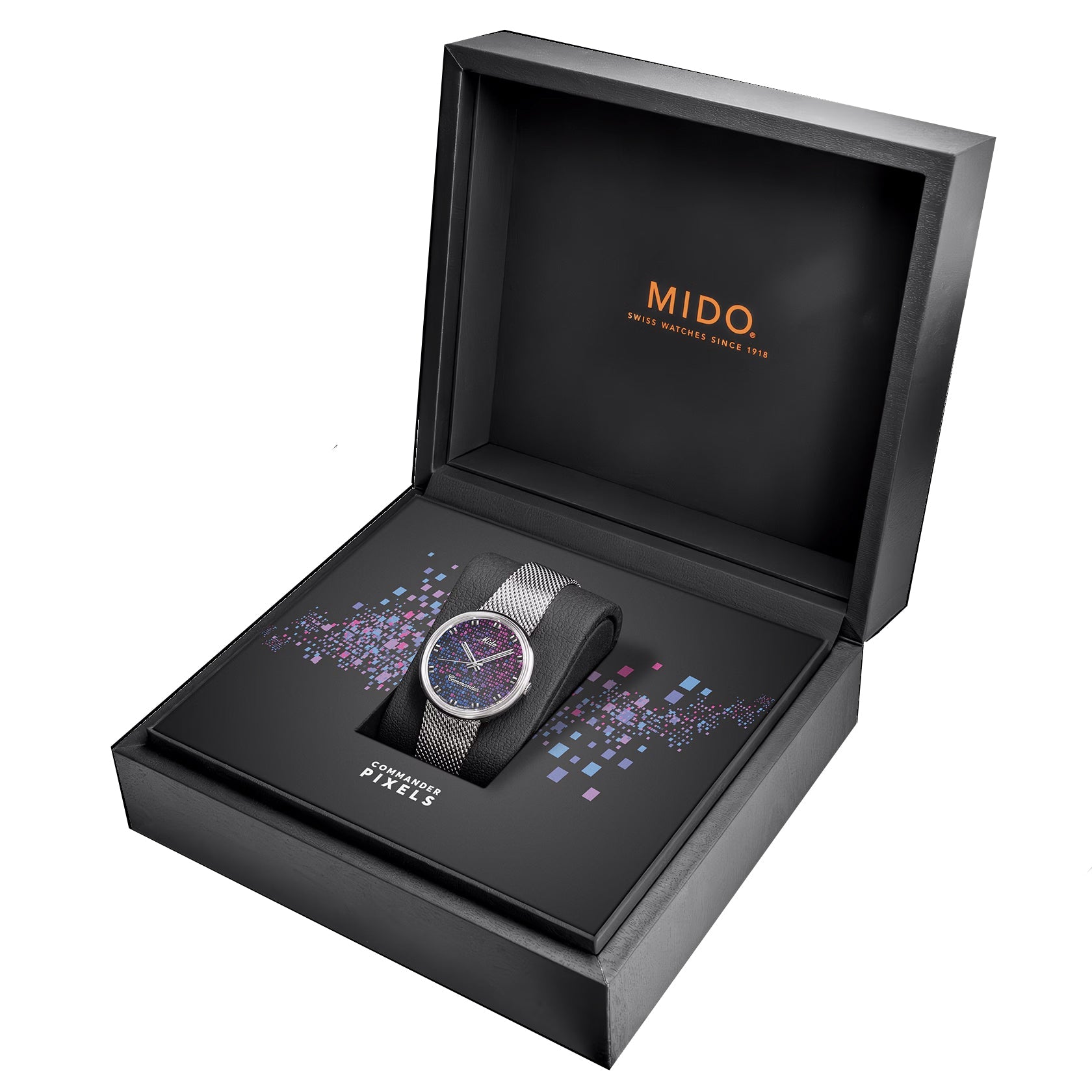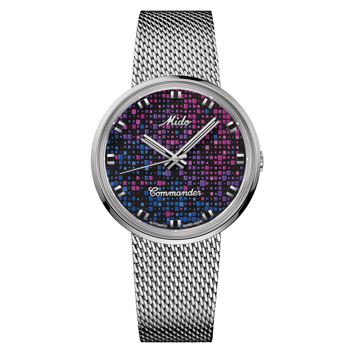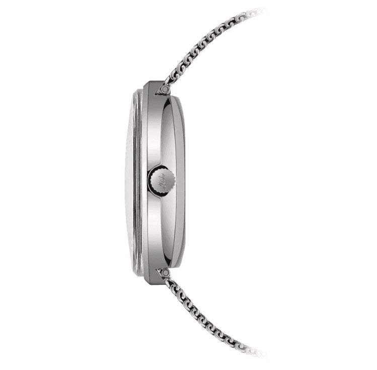 La collezione di orologi Commander 1959 viene prodotta senza interruzioni da quell'anno. Il bracciale integrato e il logo vintage di Mido sono tipici di questo modello iconico, così come la cassa monoscocca che racchiude un movimento automatico.